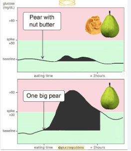 Snacking wisely is also important. Instead of grabbing a bag of chips, opt for apple or pear slices with a spoonful of peanut butter. **Pairing it with peanut butter versus fruit just by itself is very important to manage blood sugar properly! See the image below that shows the blood sugar impact of both choices.** The fiber in the fruit and the protein and fat in the peanut butter help keep your blood sugar levels steady. Another good snack is Greek yogurt with a few slices of fresh fruit.